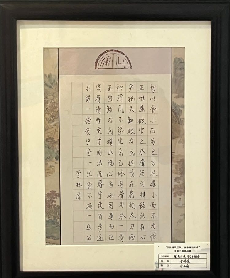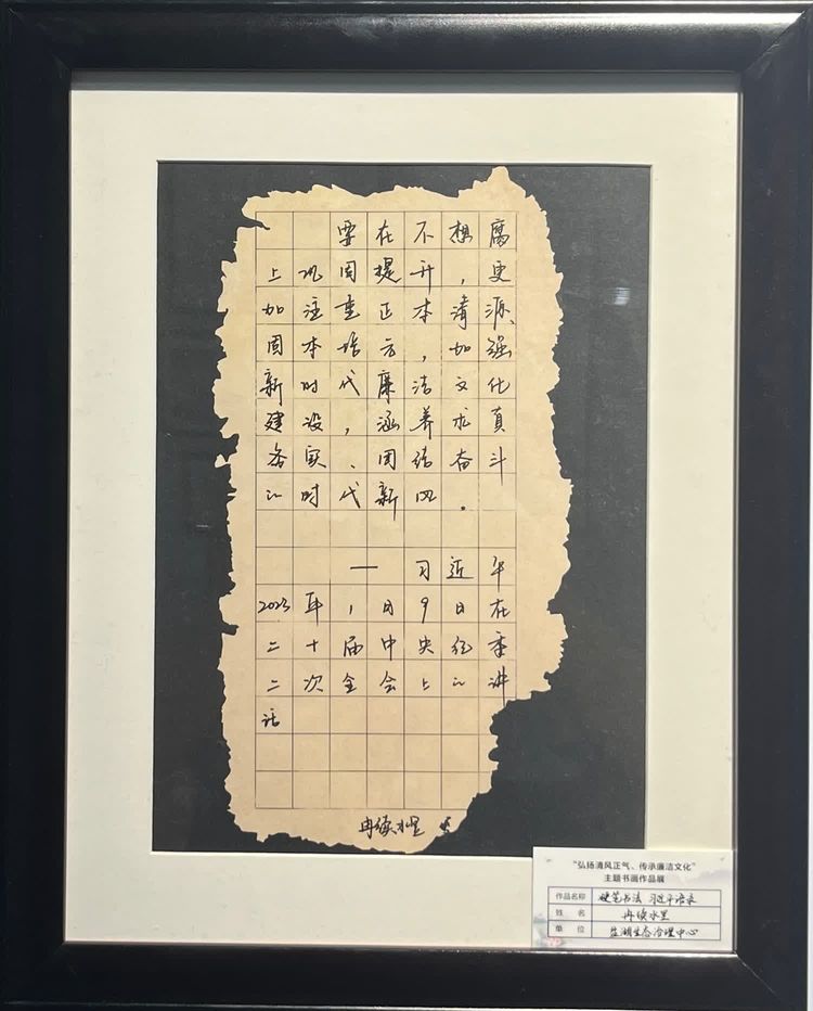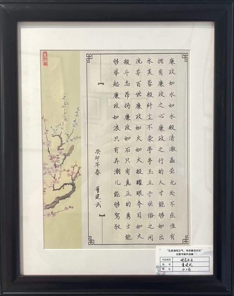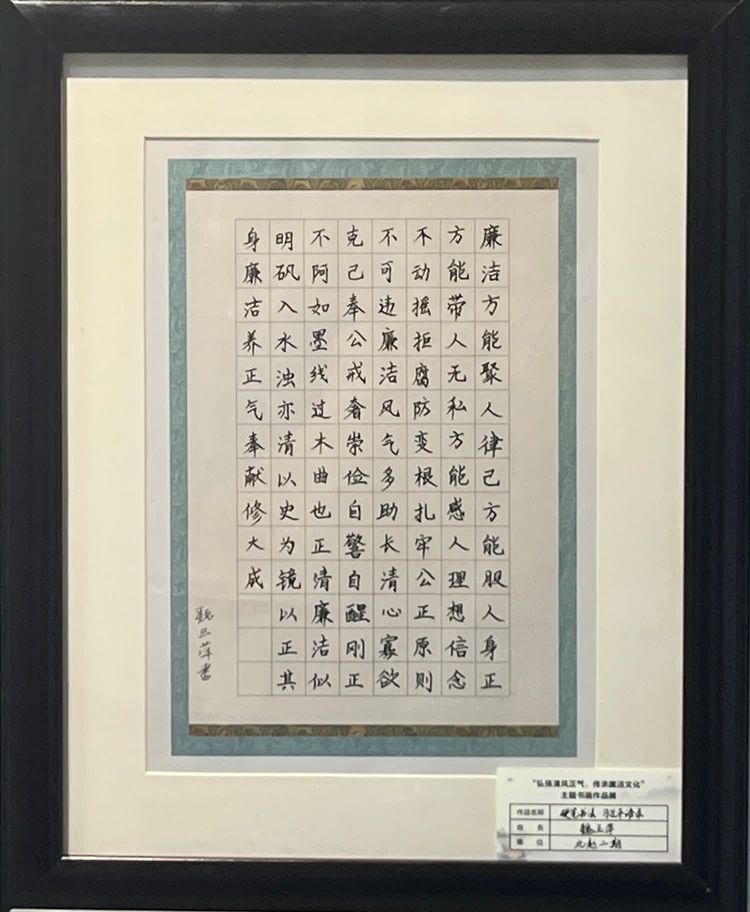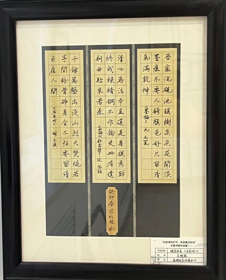“清廉者,乃清正廉潔、大道直行、奉公守法也”“粉身碎骨渾不怕,要留清白在人間”“不要人夸好顏色,只留清氣滿乾坤”《清廉賦》、《石灰吟》、《墨梅》……一張張寫滿正氣的書法、一幅幅描繪廉潔的畫卷,傳遞著清正廉潔主旋律,弘揚著擔(dān)當(dāng)實干正能量。
