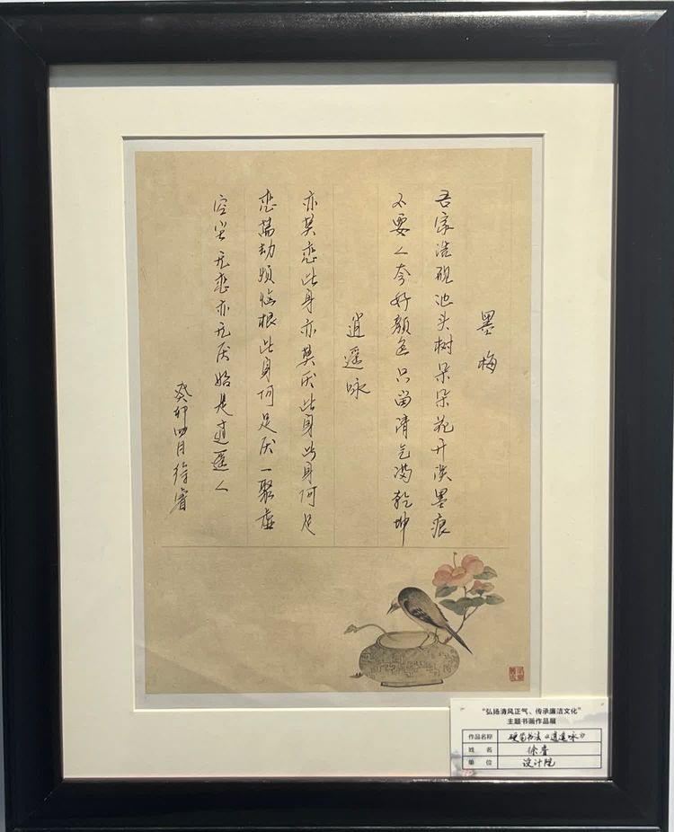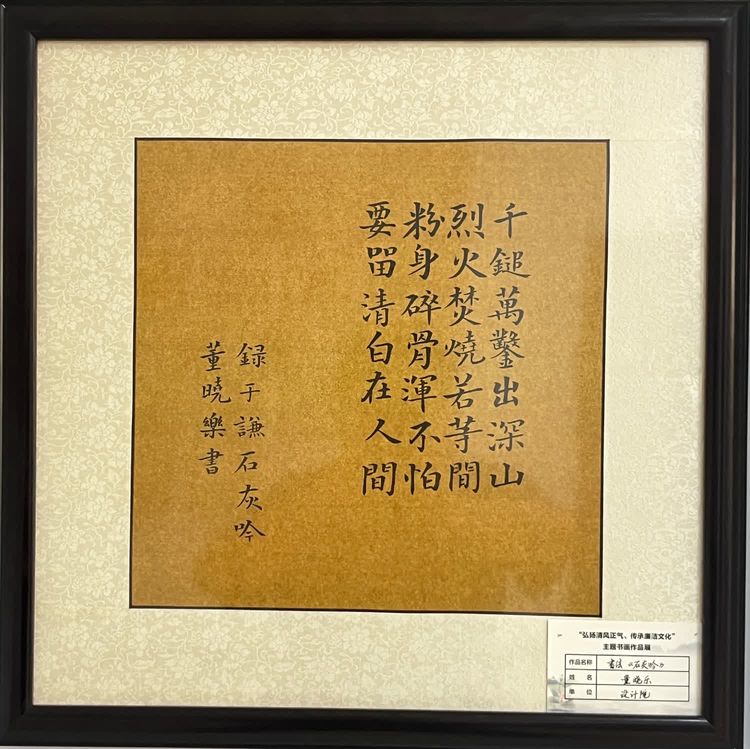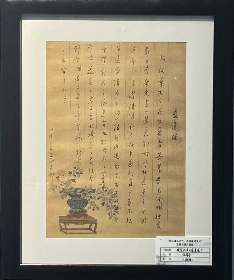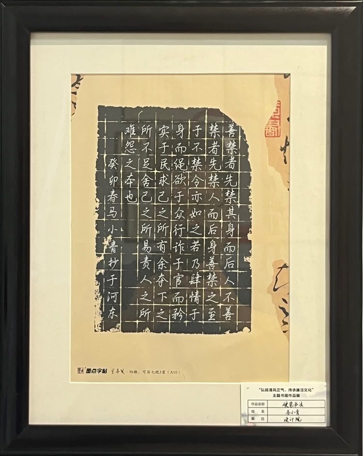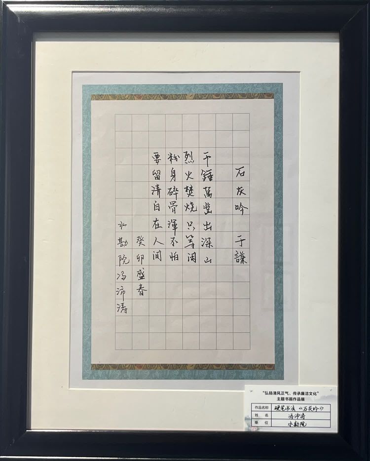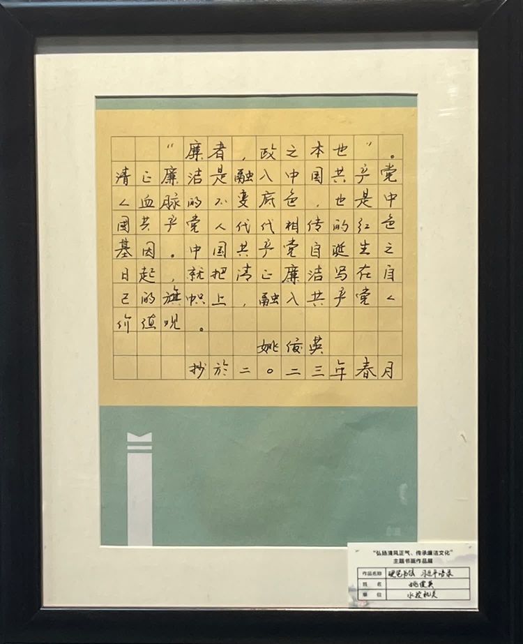“清廉者,乃清正廉潔、大道直行、奉公守法也”“粉身碎骨渾不怕,要留清白在人間”“不要人夸好顏色,只留清氣滿乾坤”《清廉賦》、《石灰吟》、《墨梅》……一張張寫滿正氣的書法、一幅幅描繪廉潔的畫卷,傳遞著清正廉潔主旋律,弘揚著擔(dān)當(dāng)實干正能量。