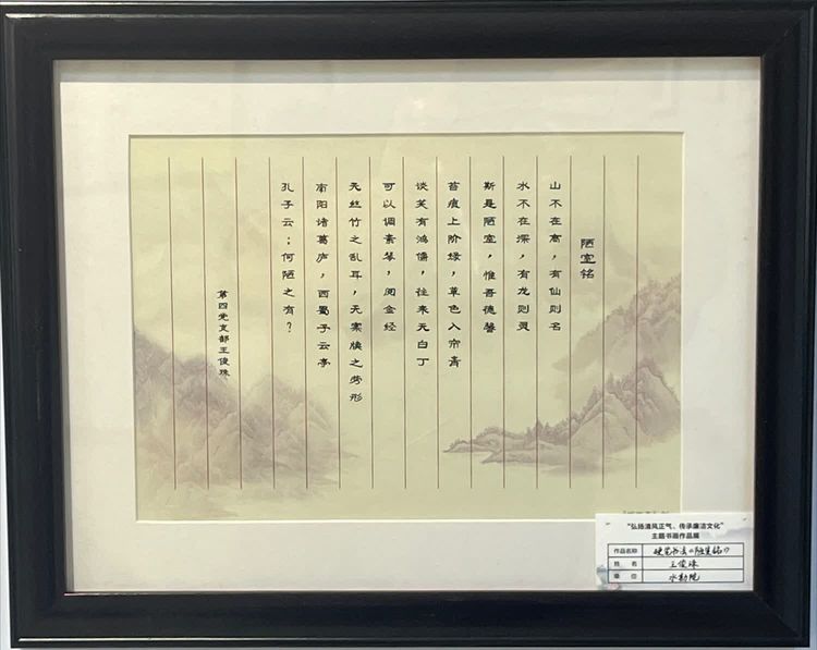 一幅幅寫滿正氣的書法、一幅幅描繪廉潔的畫卷,書畫展從籌備到展出歷時近20天,面向基層黨支部征集國畫、水彩畫、書法、攝影等作品80余件。參展作品內(nèi)容豐富、風(fēng)格多樣,創(chuàng)作者們把廉潔自律、勤政為民、警示教育、廉潔家風(fēng)等內(nèi)容融入作品中,充分體現(xiàn)廉潔文化的豐富內(nèi)涵,形象、生動、直觀地傳遞給參觀者,吸引廣大黨員干部及職工群眾駐足觀看。