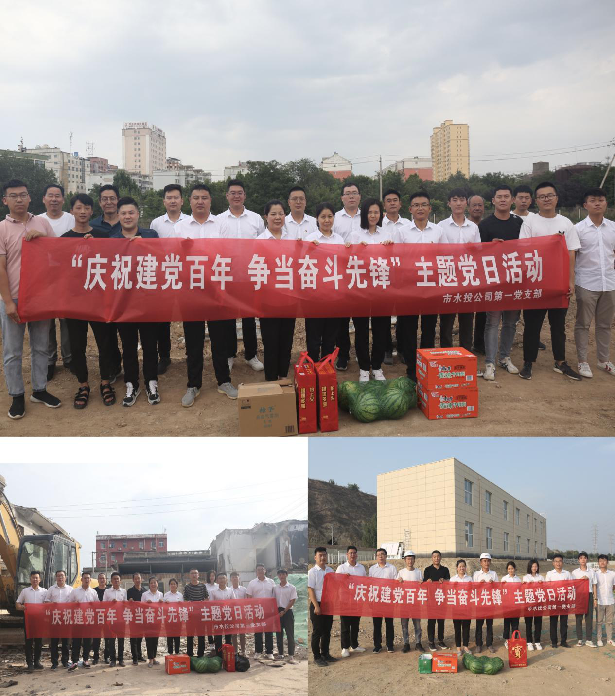 在建黨一百周年之際,為充分表達黨組織對一線黨員干部群眾頂酷暑、戰(zhàn)高溫,攻堅克難抓建設(shè)的工作干勁的鼓勵和肯定,對一線黨員干部群眾的生產(chǎn)生活提供一定的幫助,為他們送去組織的關(guān)心和關(guān)愛,在學(xué)習(xí)活動結(jié)束后,支部部分黨員、入黨積極分子共同來到干河綜合治理工程3標(biāo)段項目工地、姚暹渠禹都段項目工地和鴨子池項目工地,詳細了解各段施工進度及存在的困難問題,現(xiàn)場溝通交流、積極出謀劃策,同時為各項目工地黨員干部群眾送上了西瓜、飲料、防蚊液、花露水等消暑品。