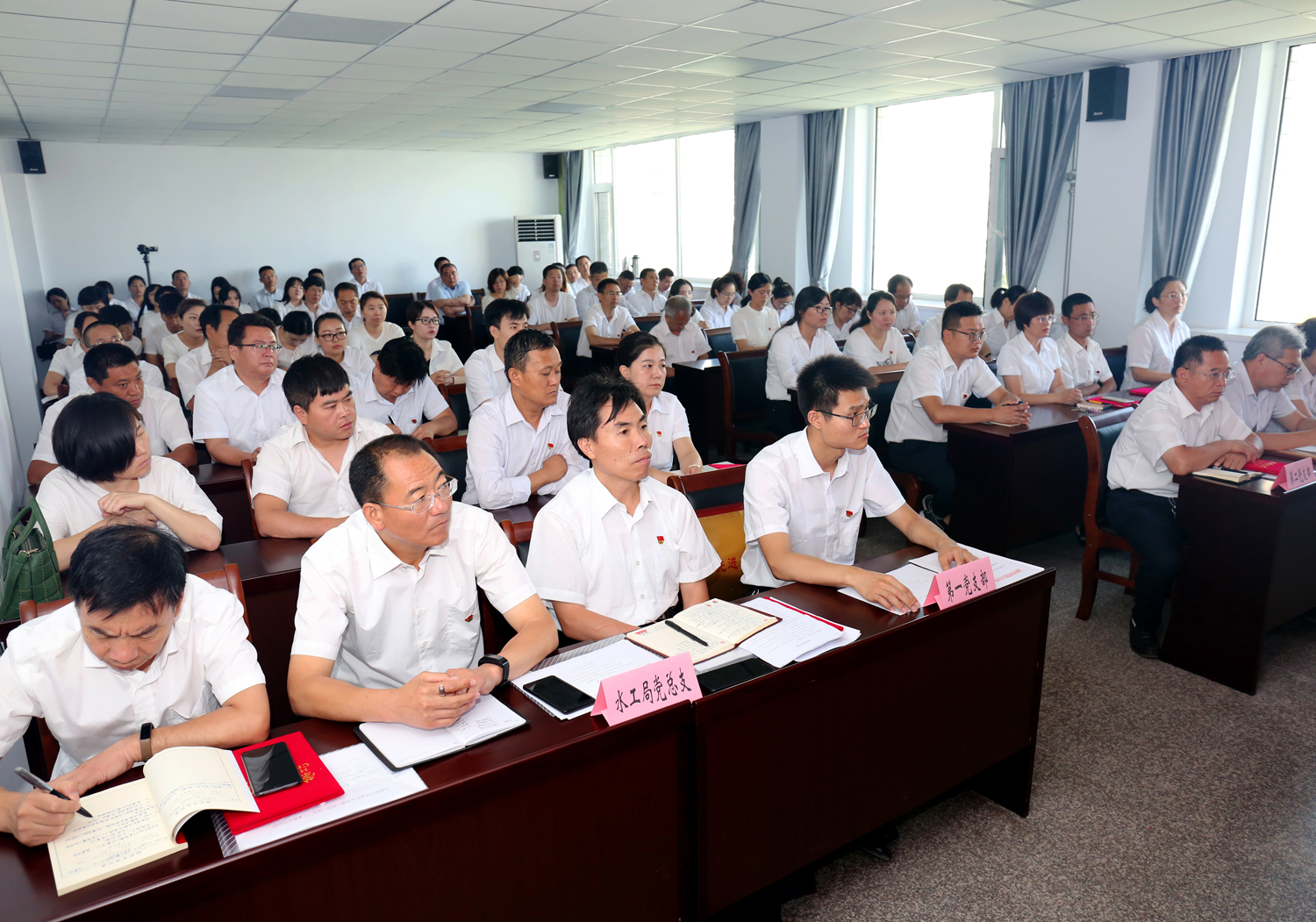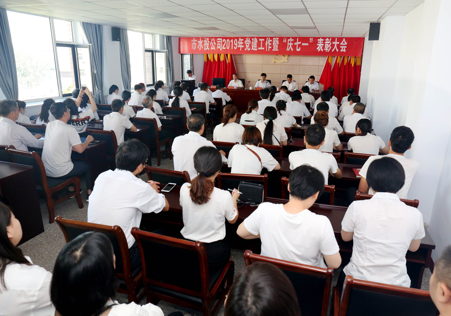 7月1日,市水投公司召開2019年黨建工作暨“慶七一”表彰大會。會議由公司黨委委員呂希汶主持,公司黨委班子成員、各支部書記及全體黨員80余人參加。市國資委黨建和領導干部管理科科長呂增軒、副科長董政軍蒞臨大會指導。