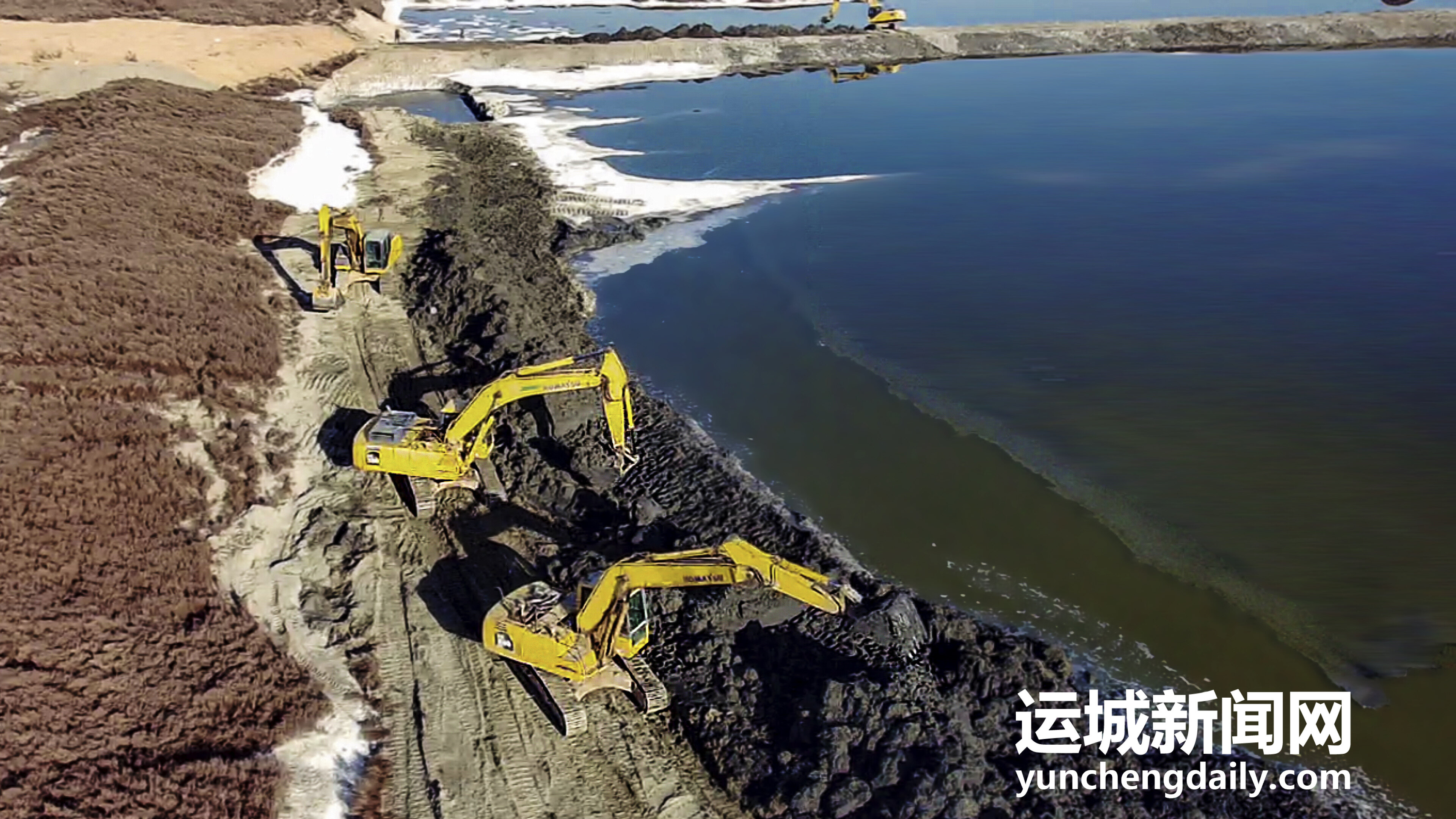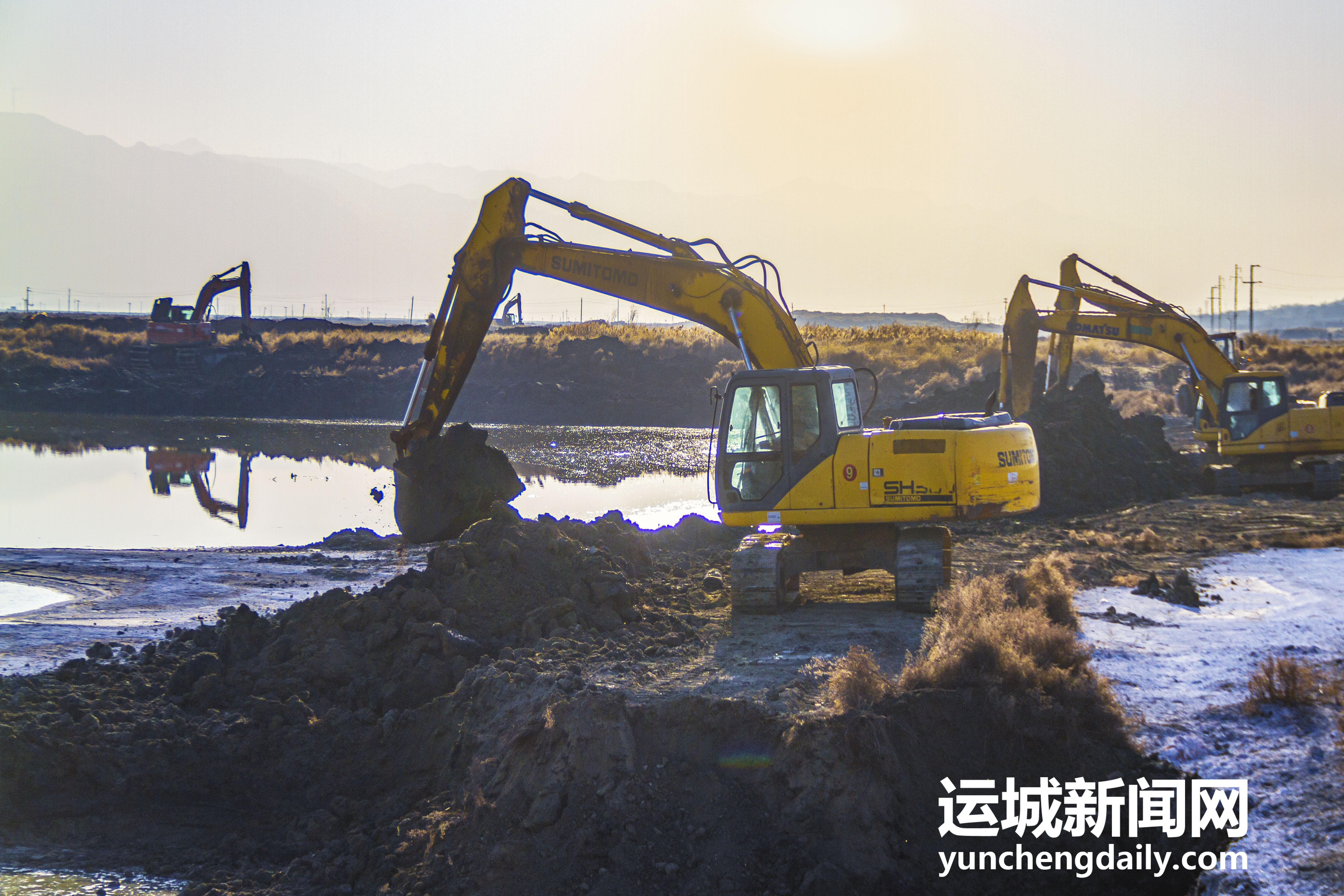 2022年12月18日,鹽湖景區(qū)內(nèi),工人師傅正在對堤埝進(jìn)行除險(xiǎn)加固。