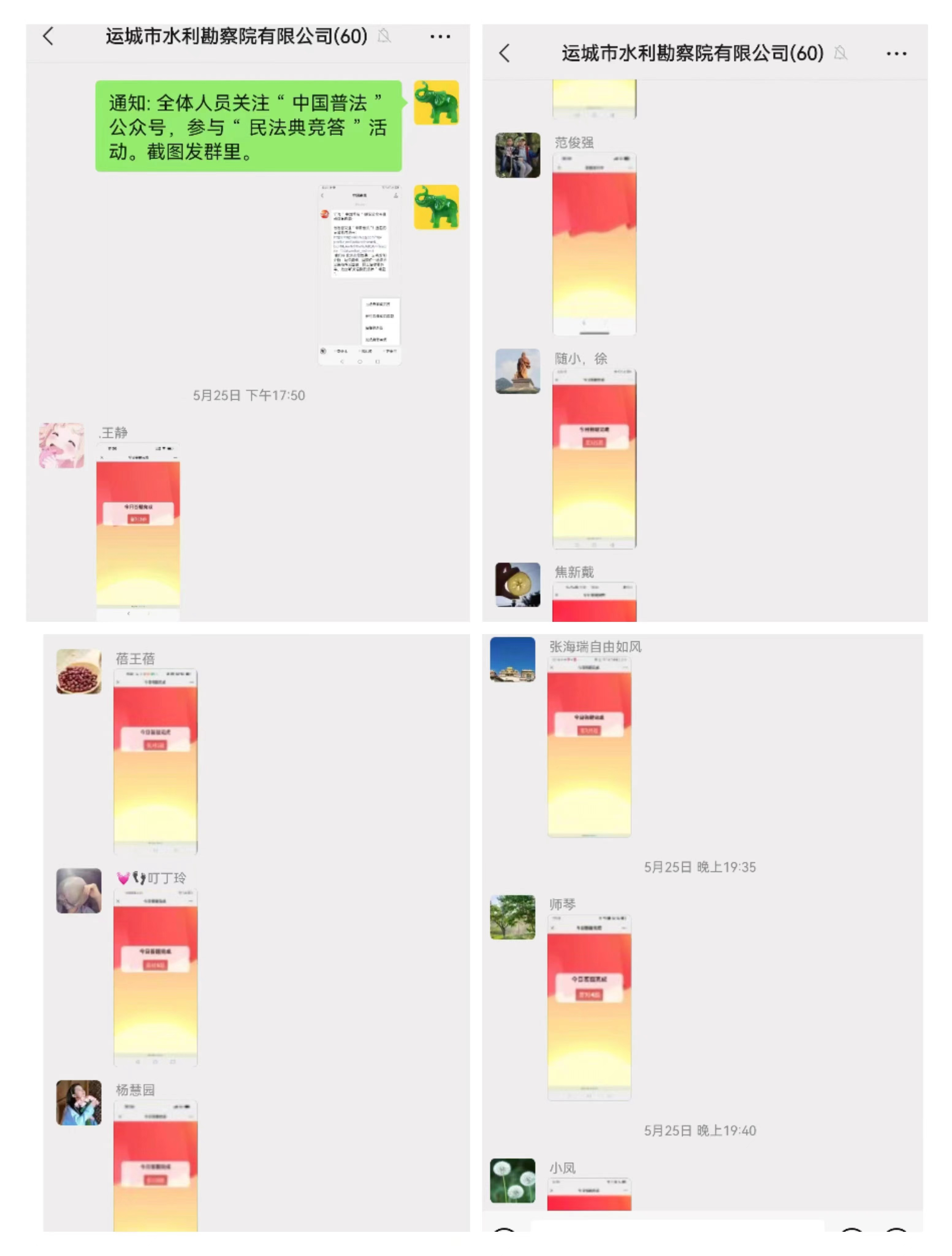 5月26日,公司組織全體干部職工參與《民法典》知識(shí)競答活動(dòng),活動(dòng)以線上答題形式展開,通過關(guān)注并登錄“中國普法”微信公眾號(hào),在“齊參與”欄目中進(jìn)行。職工們積極踴躍,迅速掀起了答題熱潮,堅(jiān)持每日答題,在公司形成了學(xué)習(xí)法典、運(yùn)用法典、崇尚法典的良好氛圍。此次活動(dòng)的開展,讓全體干部職工切實(shí)意識(shí)到民法典在工作生活中保護(hù)自身合法權(quán)益方面的重要作用,進(jìn)一步提高了干部職工的學(xué)法氛圍和法治意識(shí),為建設(shè)團(tuán)結(jié)和諧、文明進(jìn)步的大美運(yùn)城提供了堅(jiān)強(qiáng)的法治保障。