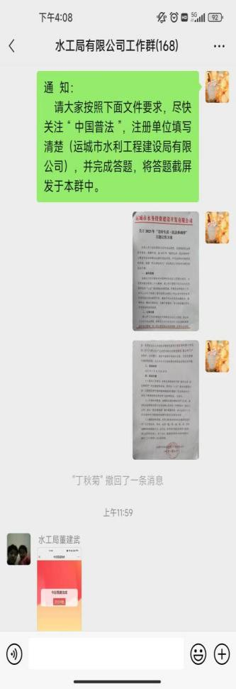 為加大《民法典》宣傳,努力讓每一名干部職工走進(jìn)民法典、了解民法典、運(yùn)用民法典,切實(shí)增強(qiáng)廣大干部職工的法治意識(shí)和法治信仰,5月29日運(yùn)城市水利工程建設(shè)局有限公司組織干部職工開展2023年“美好生活•民法典相伴”主題活動(dòng)?;顒?dòng)現(xiàn)場傳達(dá)了運(yùn)城市水務(wù)投資建設(shè)開發(fā)有限公司《關(guān)于2023年“美好生活•民法典相伴”主題宣傳方案》,并向大家介紹了民法典的重要意義?;顒?dòng)中干部職工積極關(guān)注“中國普法”,注冊(cè)賬號(hào)并進(jìn)行了答題。此次活動(dòng)激發(fā)干部職工主動(dòng)學(xué)習(xí)法律知識(shí),增強(qiáng)了用法治思維和法治方式解決問題的能力。